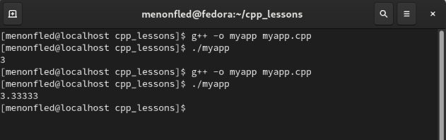 このようにint型の変数aとbを使って割り算した結果を出力すると、結果は次のようになります。