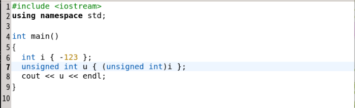 たとえば、次のようにint型の変数iを使ってunsigned int型の変数uを初期化しようとすると、iの値「-123」をunsigned int型に変換した上でuの初期値に使うことになります。