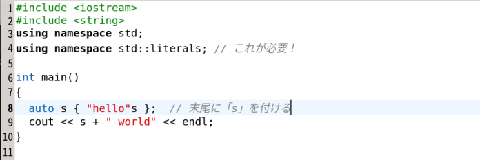 まず、ソースファイルの冒頭(#include <string>よりあと)でusing namespace std::literals;と書いてください。