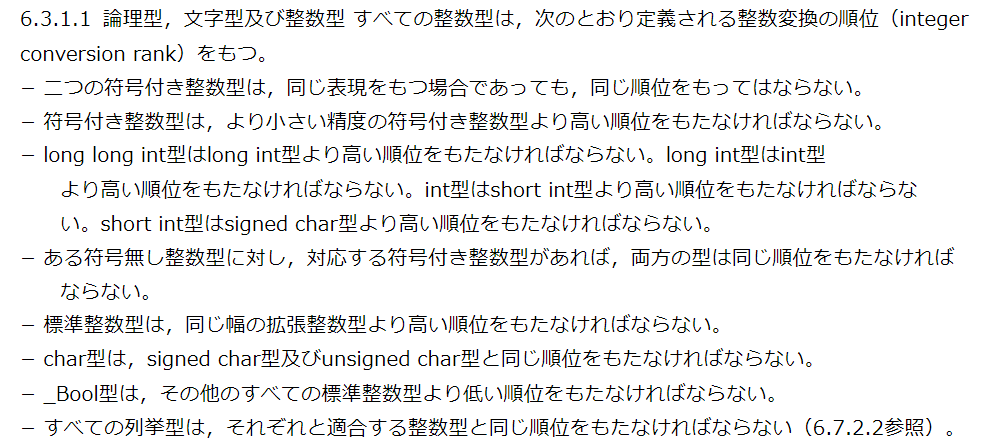 要約すると、整数型の大きさはsigned char型 ≦ short int型 ≦ int型 ≦ long int型 ≦ long long int型で、変換の順位もこれと同じになるということです。