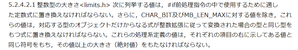 このあとに、たとえばINT_MAXやINT_MINのような各整数型の最大値と最小値の規定が続きます。