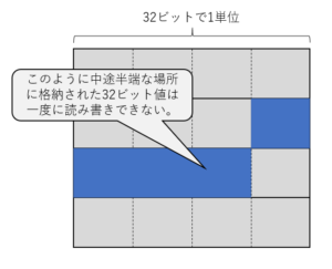 次の図のように、中途半端な場所に格納された32ビット値は一度に読み書きすることができません。