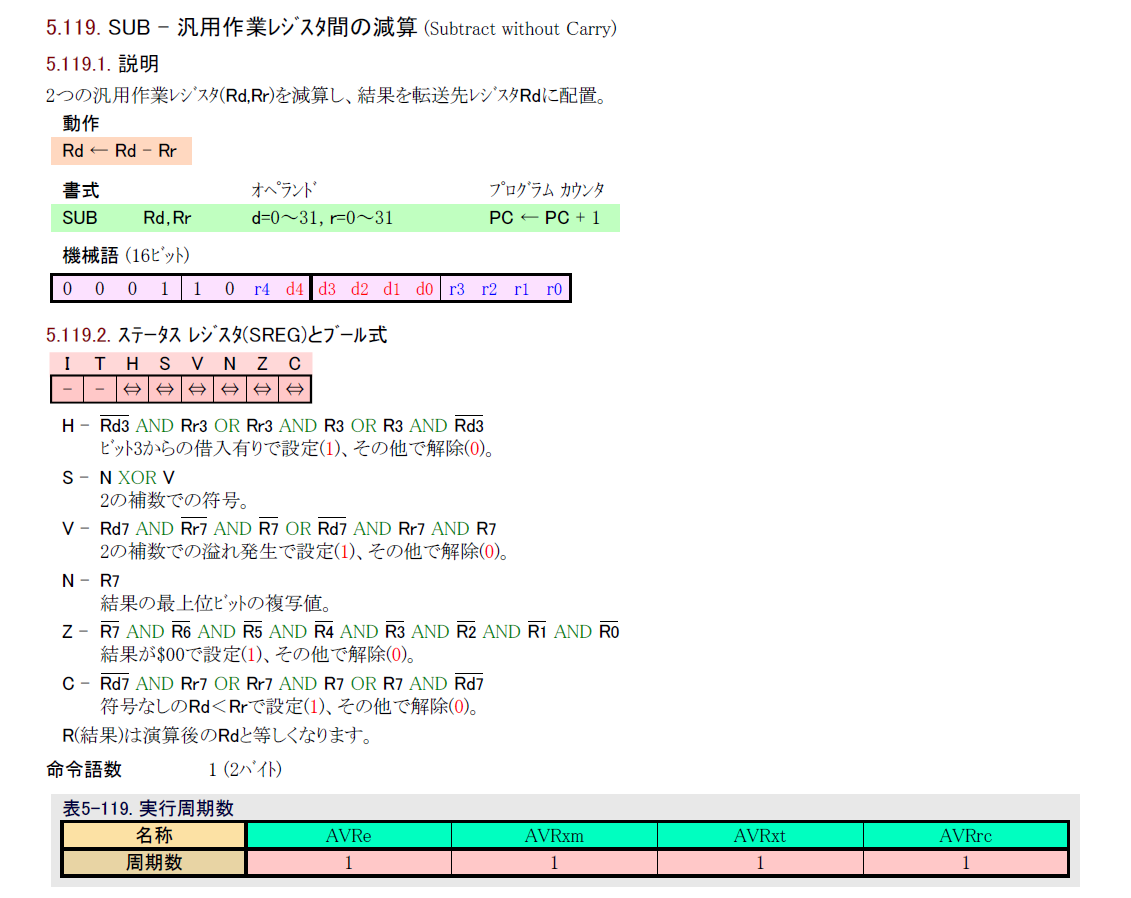 avr-sub 公開日:2021年7月4日 この記事を書いている人 めのん 大学卒業後、某メーカーにハードウェアエンジニアとして勤務ののち独立。 フリーランスのプログラマーとして活動を続け、現在は法人化しています。 得意分野は組込みや機器の制御プログラムの開発です。 一番得意なプログラミング言語はCですが、ほかにアセンブリ、C#、Java、C++、PHPができます。 Zigも勉強しましたがまだまだです。 執筆記事一覧 投稿ナビゲーション 減算命令の実装