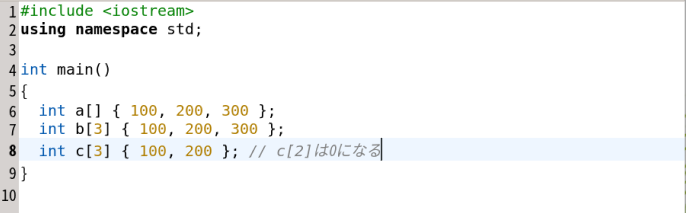 逆に角括弧の中に数値を書いて要素数を指定した上で、波括弧の中の初期値が要素数より少ない場合は、残りの要素は0で初期化されます。