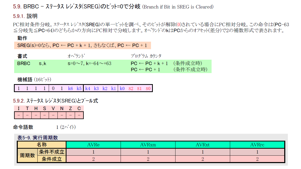 BRBC命令はBRBS命令の逆で、ステータスレジスタの指定したフラグが0のときに分岐が発生します。