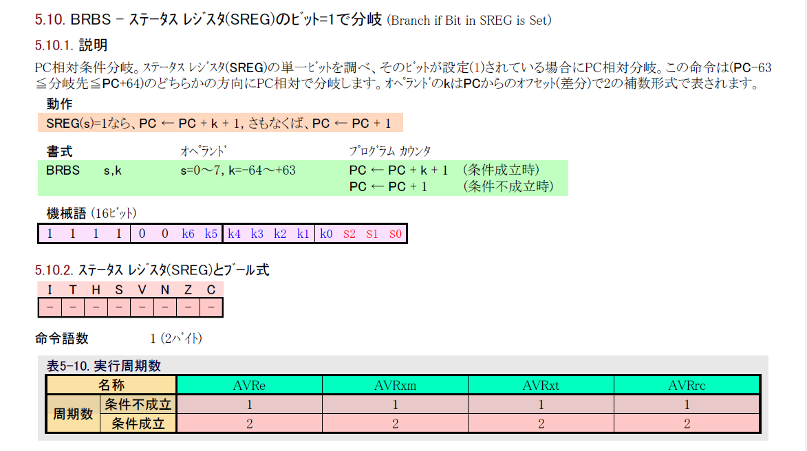 いつものように「AVR®命令一式手引書」からBRBS命令の説明を引用します。
