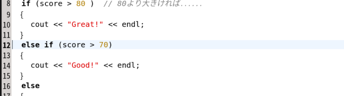 次にscoreの値が80より大きかったら何らかの処理をするコードを書いていきます。