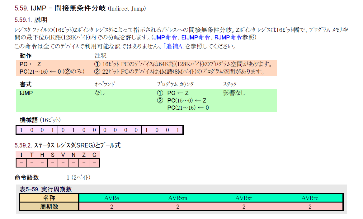 avr-ijmp 公開日:2021年5月16日 この記事を書いている人 めのん 大学卒業後、某メーカーにハードウェアエンジニアとして勤務ののち独立。 フリーランスのプログラマーとして活動を続け、現在は法人化しています。 得意分野は組込みや機器の制御プログラムの開発です。 一番得意なプログラミング言語はCですが、ほかにアセンブリ、C#、Java、C++、PHPができます。 Zigも勉強しましたがまだまだです。 執筆記事一覧 投稿ナビゲーション IJMP命令とICALL命令の実装
