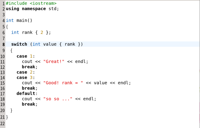 ifの条件でも変数を宣言できたように、switchでも丸括弧の中で宣言することができます。