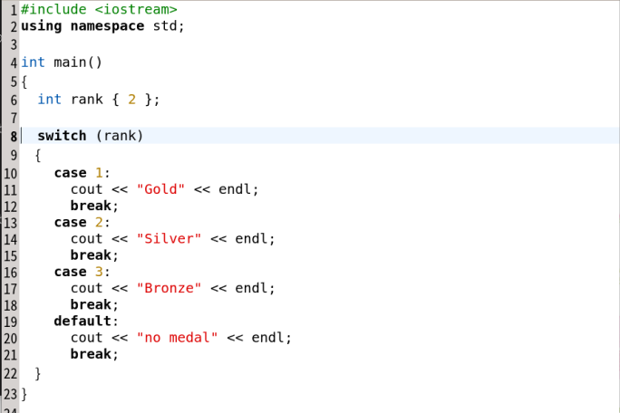 rankが1でも2でも3でもない場合はdefaultと書いたところが処理されて「no medal」と出力されます。