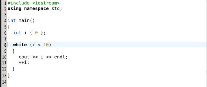 そのあとのwhileでは、iが10より小さい間、波括弧内の処理を繰り返すようになっています。
